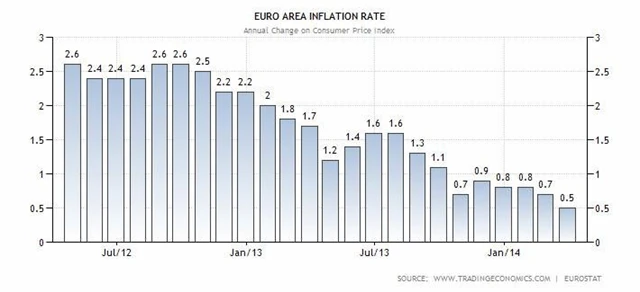 Příliš slabé inflační tlaky mohou ohrozit oživení eurozóny. Spotřebitelské ceny v regionu vzrostly v březnu meziročně o 0,5 % (nejpomalejším tempem od října 2009). ECB přitom cíluje inflaci na 2 %.