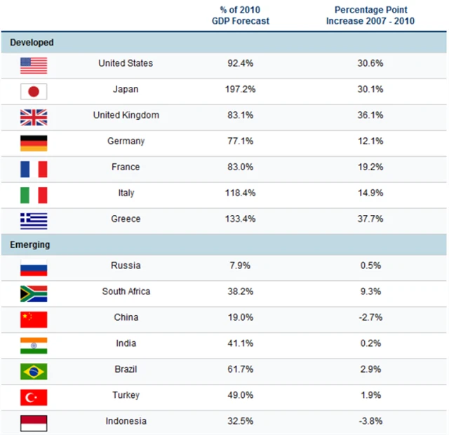 V minulosti vždy platilo, že země emerging markets byly citlivé na vnější podněty a stojí v pozadí hospodářských krizí. Při pohledu na tabulku je zřejmé, že současné problémy vyspělého světa (vysoké dluhy a deficity státních rozpočtů) se zemíemerging markets příliš netýkají.