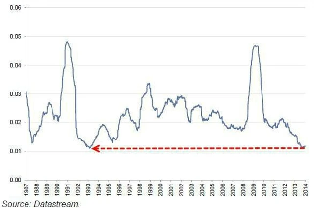 Nerovnováha mezi aktuálním děním na trhu a selským rozumem, který by v období růstu napětí na Ukrajině radil sázet na velké výkyvy cen ropy, je evidentní. Volatilita ceny ropy je nejnižší za 21 let.