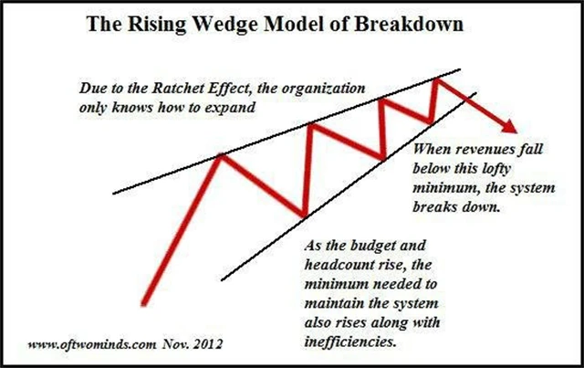 Produkce se snižuje, náklady rostou a nůžky se zavírají. Příkladem ze současnosti jsou ropné ekonomiky, které si své obyvatele koupily petrobohatstvím. Obyvatelé požadují stále větší benefity, což znamená neustálý růst příjmů, a tedy nutnost stále dražší ropy. Když cena klesne, přestávají být tyto režimy schopny financovat svůj blahobyt. Následuje sociální revolta a krach systému.