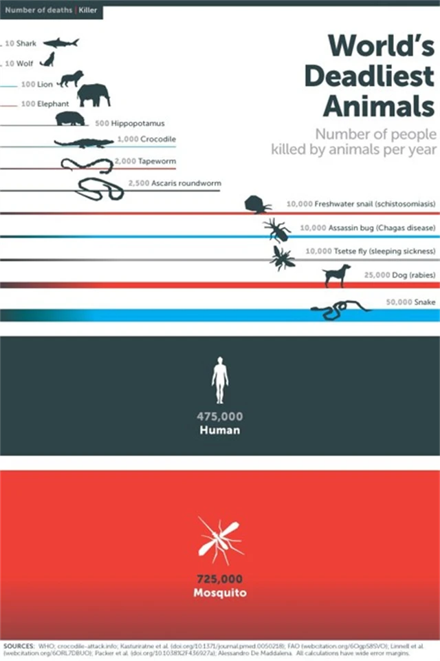 Bill Gates říká, že od doby, co viděl film Čelisti, má strach ze žraloků. Kdo nemá. Asi se ho při setkání nebudete bát tolik, ale pamatujte na to, že komár má ročně na svědomí nesrovnatelně více lidských životů. Dokonce více, než kolik jich ročně ukončíme my sami. Gates na to upozorňuje v souvislosti se svou charitativní činností.