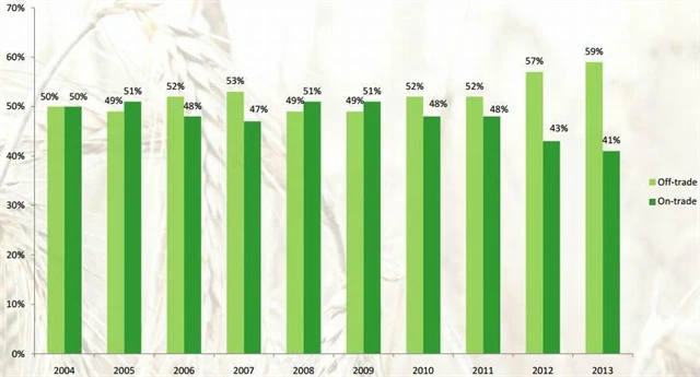 Pijáci piva se přesouvají z hospod a restaurací domů a kupují levnější piva v lahvích. Tento trend je pravděpodobně způsoben zvýšením cenového rozdílu mezi točeným a lahvovaným pivem a zvýšenou citlivostí spotřebitelů na cenu v období ekonomické krize.