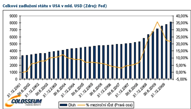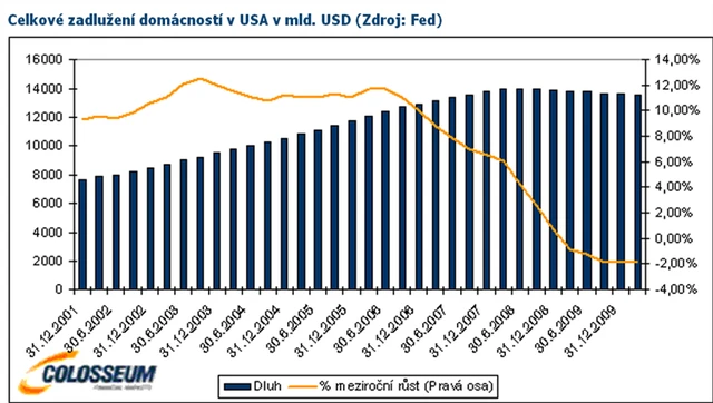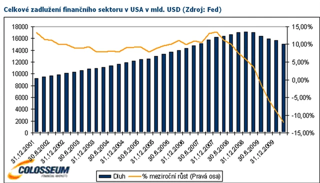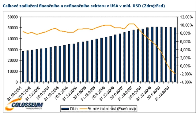 Vezmeme-li v úvahu celkový dluh finančního i nefinančního sektoru v USA, zjistíme, že se pohybuje na úrovni 350 % HDP. Nejvyšší hodnoty bylo dosaženo na konci prvního čtvrtletí 2009. V současnosti se nacházíme 1,9 % pod touto úrovní. Celkový obraz tudíž naznačuje, že zatím rozhodně nejsme svědky žádného výrazného snižování zadlužení.