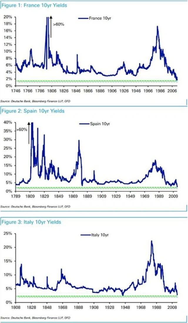 10leté francouzské výnosy dosáhly intradenně hodnoty 1,654 %, tedy minima v historii dat zpětně do roku 1746. 10leté španělské výnosy také spadly na minima na základě datové řady sahající do roku 1789. Italské výnosy byly nižší jen po několik měsíců začátkem roku 1945 (zde data sahají zpětně až do roku 1808).