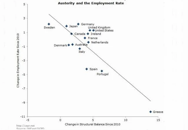 Ben Wolcott ze Center for Economic And Policy Research porovnal země, které rozpočtové škrty provedly, s těmi, které zvolily mírnější přístup. "Pokud by obhájci rozpočtových škrtů měli pravdu, očekávali bychom pozitivní korelaci šetření s růstem zaměstnanosti. V tomto vidění světa by země jako Řecko nebo Španělsko výměnou za škrty obdržely mezinárodní pomoc a zvýšenou důvěru investorů, což by mělo rychle obnovit plnou zaměstnanost," píše.