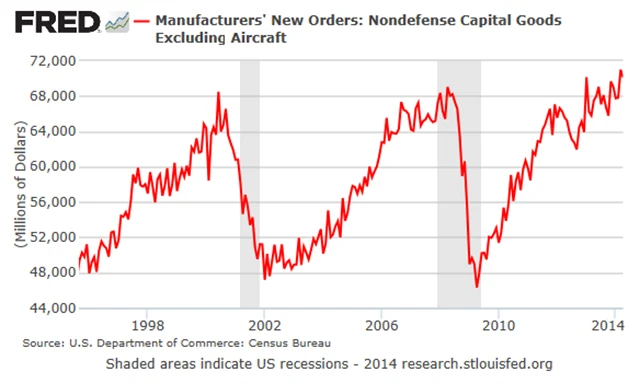 Graf nových objednávek kapitálového zboží mimo sektor obrany (data Fedu v St. Louis) demonstruje brutalitu těchto škrtů (například jejich snížení o třetinu z 69 miliard USD v srpnu 2008 na 46 miliard v dubnu 2009).