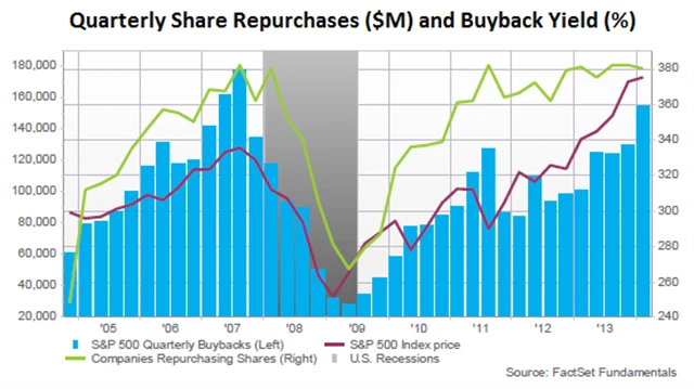 Za posledních 12 měsíců firmy skoupily vlastní akcie za 535 miliard USD, přičemž nákupy financovaly hlavně vypůjčenými penězi. Je to ale stále pod rekordními 603 miliardami USD za 12 měsíců končících v 3. kvartálu 2007, tedy na počátku finanční krize.