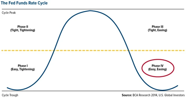 Následující graf BCA znázorňuje cyklus úrokových sazeb Fedu. Červený kruh značí fázi, v níž se nacházíme nyní, tedy fáze IV, uvolňování měnové politiky (známé jako kvantitativní uvolňování), spuštěné centrální bankou na konci finanční krize.