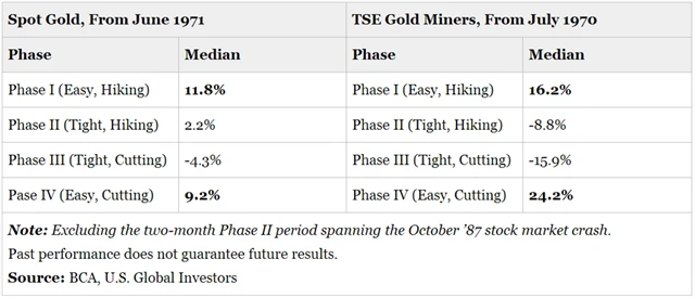 Tabulka znázorňuje mediánové výnosy během cyklu a dívá se zpětně až k roku 1971, respektive 1970. Fáze IV a I znamenají nejvyšší mediánové výnosy pro zlato a zlaté akcie. Důvodem pro vysoké výnosy během obou fází je existence levných peněz. Jejich nedostatek, na němž jsou postaveny fáze II a III, je typicky nepříznivý pro investory do zlata (když je peněz nedostatek, nebývá vysoká inflace a investoři se nepotřebují uchylovat ke zlatu jakožto zajištění proti ní).