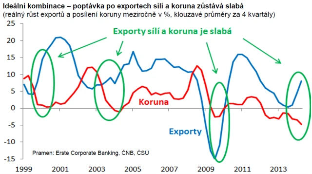 Podobná situace sílících exportů a slabé koruny tu byla pouze třikrát – v letech 1999 až 2000, 2003 až 2004 a v roce 2009. Ve všech případech byly nasnadě silné důvody předpokládat, že koruna nebude následovat sílící exportní ekonomiku. Bylo to hlavně přesvědčení, že dohánění evropských ekonomik ve výkonnosti i cenové hladině je u konce a česká ekonomika na silnější korunu zkrátka nemá. V těch dobách nebylo slyšet o příliš silné koruně jako problému pro české exportéry. **Koruna se naopak stala miláčkem trhů a likvidačním problémem pro vývozce, když byl posilující trend zdálky viditelný, a paradoxně, když vývozy slábly (2002, 2008, částečně 2011).