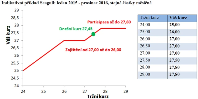 Strategií Seagull zajistíte prodej eur za kurz blízko současné bariéry ČNB. Bude-li se kurz EUR/CZK dále plácat v současném rozmezí, budete prodávat za spot. Tyto výhody jsou kompenzované následovně: