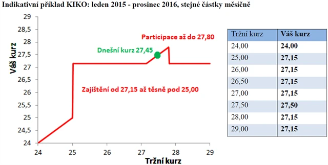 - rozsah zajištění je také omezený. Oproti strategii Seagull má KIKO vyšší zajišťovací kurz a rozsah zajištění, avšak také větší penalizaci, oslabí-li koruna nad horní omezení. Navíc se zajištění vypne, posílí-li koruna pod spodní omezení (jak ukazuje indikativní příklad zajištění na dva roky).