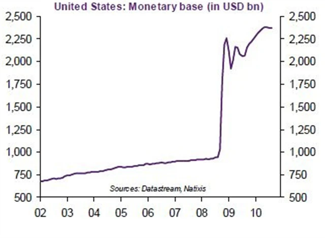 Fed od vypuknutí finanční krize "vytvořil" zhruba 1 400 miliard dolarů (graf ukazuje nárůst peněžní báze z 900 na 2 300 miliard), ale z ekonomiky "zmizelo" zhruba 5 000 miliard dolarů, o které poklesl objem vydávaných MBS a ABS (Mortgage Backed Securities a Assets Backed Securities – tedy hypotékami krytých cenných papírů a aktiv krytých cennými papíry, především spotřebitelskými úvěry).