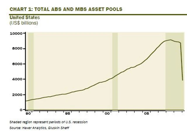 Objem vydaných MBS a ABS poklesl ze své maximální hodnoty 9 000 na 4 000 mld. USD. Americké banky svoje uzavřené hypoteční a spotřebitelské úvěry zabalily do těchto MBS a ABS a prodaly je do celého světa, a právě tento vysoký nárůst nových úvěrů byly ty inflační peníze, které nafukovaly nemovitostní bublinu v USA a nepřímo v celém západním světě.