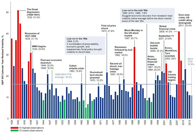 Nízká volatilita může vypadat z laického pohledu jako pozitivní věc, jenže opak je pravdou. Podívejte se na historii volatility na americké burze.