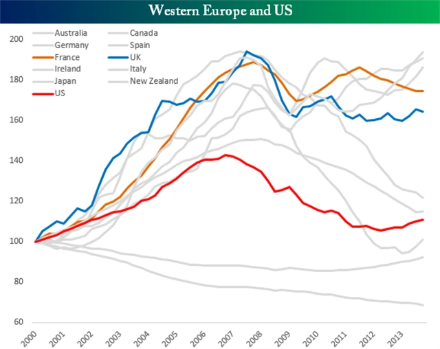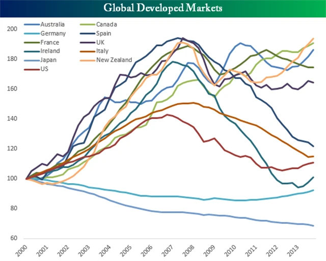 Spojené království a USA jsou ale nakonec jedněmi z nejméně zajímavých nemovitostních trhů. Níže uvedený graf zachycuje ceny 11 indexů cen domů na vyspělých trzích (báze 100 odpovídá 1. kvartálu 2000). Data jsou převzata z analýzy světových cen bydlení dallaského Fedu. Počítá se s reálnými cenami domů (ceny jsou očištěny o inflaci s využitím deflátoru PCE pro každou sledovanou zemi).