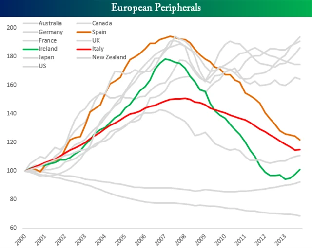 V periferních zemích eurozóny není patrné oživení, ceny bydlení stále hledají dno po masivním ústupu z historických maxim v roce 2007. Irsko vykazuje známky oživení, Španělsko a Itálie zatím dno nenašly.