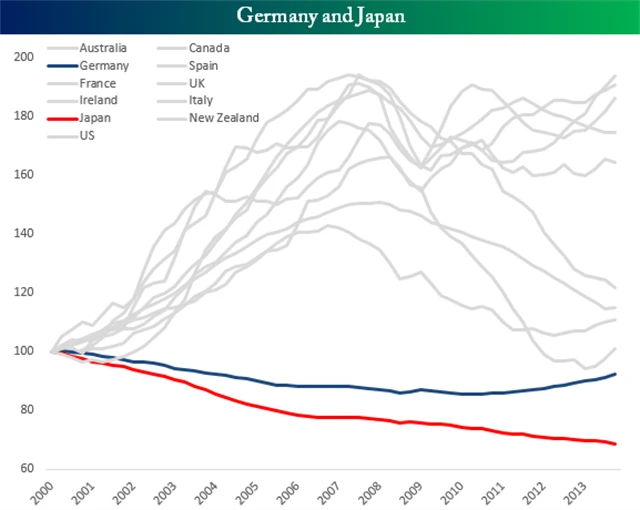 Německo a Japonsko z grafu vycházejí jako stálí poražení z pohledu zhodnocování realit. Ani jeden z trhů se významně nevzdálil od úrovně z roku 2000, na rozdíl od prakticky všech ostatních zemí. V Japonsku dochází k setrvalému deflačnímu sestupu. Příčiny zaostávání trhů Německa a Japonska jsou ale dány částečně kulturně a částečně ekonomicky. V Japonsku jsou reality považovány daleko více za spotřebu než investici a v zahuštěném prostoru japonských velkoměst není mnoho prostoru na investiční "hrdinství". V Německu je mnohem aktivnější trh s pronájmy, navíc daňová legislativa není příliš motivující, pokud jde například o hypotéky.