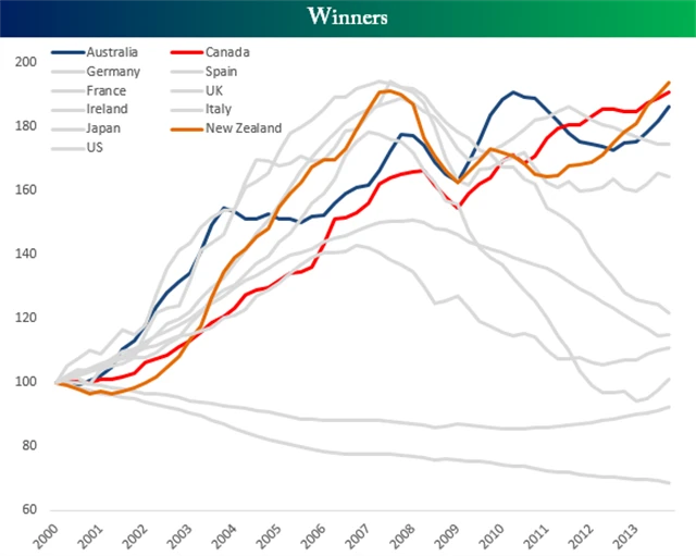 Boom kanadského trhu tažený zahraničními investory (ve městech, jako je Vancouver) a rozvojem ropné produkce v centrálních provinciích (zejména v Albertě) je zatím neotřesitelný. Austrálie zažila mírný pokles, nyní ale už opět zažívá růst. Skutečným vítězem je ale Nový Zéland. Ceny bydlení zde vzrostly o více než 93 % od roku 2000, což je nejlepší výkon mezi vyspělými ekonomikami. Není proto divu, že novozélandská centrální banka začala zvyšovat sazby.