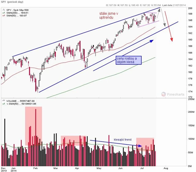 Korekce v lednu i březnu byly doprovázeny zvýšenými objemy, růst v květnu a červnu naopak klesajícími. Nyní jsme opět v podobné situaci jako u předchozích korekcí – samotná korekce sice ani nezačala a ceny se drží u maxim, objemy ale vykazují "korekční mód". Mám obavu, že trh je nachystaný na to, aby nějaká větší negativní událost spustila výrazný výprodej. Záminkou přitom může být cokoli.