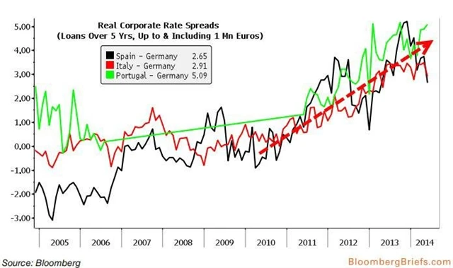 Graf, který možná nedá Mariovi Draghimu klidně spát, ukazuje rozdíl v úrocích z firemních půjček v Německu a zemích PIIGS. Tento spread roste, získat úvěr v zemích, které stále čekají na výraznější ekonomické oživení, je tedy pro firmy, hlavně ty malé a střední, stále dražší. ECB přitom usiluje o opak.