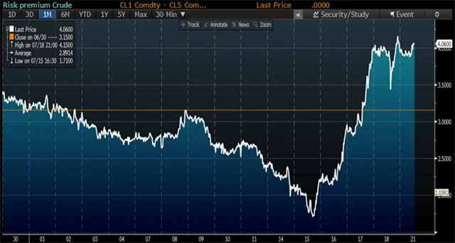 Osobně geopolitické riziko měřím prostřednictvím spreadu mezi pátým a prvním kontraktem na americkou ropu WTI. Samozřejmě jsou tady i další faktory k zohlednění, ale když chybí lepší alternativa, používám zmíněný spread. Jak je z grafu patrné, od 15. července válečná prémie (neutrálněji řečeno disrupční prémie) vzrostla o dva dolary. Světoví spotřebitelé tak platí za barel ropy WTI o dva dolary více. Trh s ropou sice ovlivňuje spousta faktorů, ale je potřeba myslet na to, že cena energie zůstává většinou stabilní nebo spíše klesá.