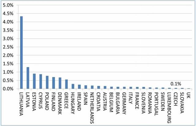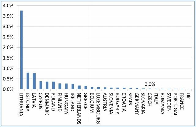 Pokud se podíváme na jednotlivé země, vidíme, že dopad nebude rovnoměrný. Nepřekvapí jména hlavních postižených. Největší podíl vývozu potravin do Ruska na celkových vývozech mají pobaltské země (Litva dokonce přes 10 %), Polsko a Kypr.