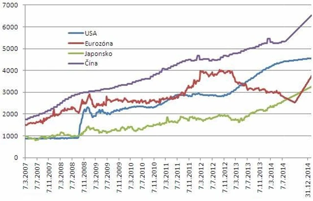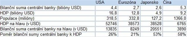 Srovnání čtyř největších ekonomik ukazuje, že především v ukazateli poměru bilanční sumy a HDP asijské země předehnaly jak USA, tak eurozónu. Zde se poměr již nyní pohybuje vysoko nad úrovní 50 %. Na každého z 1 366 milionů Číňanů připadá 3 890 dolarů bilanční sumy. U Japonska je tento poměr dokonce již teď vyšší než v eurozóně a USA, když přesahuje 20 tisíc dolarů.