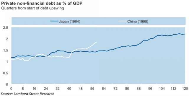 Zadlužení Číny (mimo finanční sektor) roste rychleji než obdobný ukazatel v Japonsku ve stejné fázi jeho růstového příběhu, který začal v 60. letech.