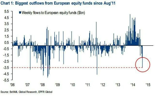 Oživování evropského hospodářství je nejisté a v kombinaci s vývojem událostí na východní Ukrajině se jedná o jednoznačný argument k odsunu investičních prostředků z evropských trhů. Alespoň podle komentátorů tak lze interpretovat pokračující odliv peněz z amerických fondů investujících do evropských akcií.