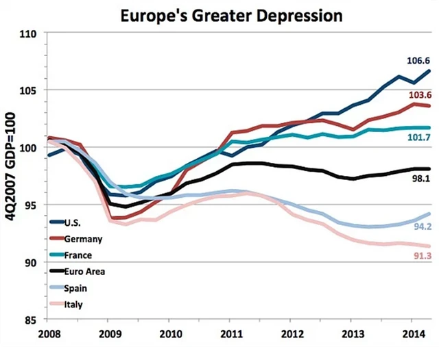 Je to šest a půl roku a HDP eurozóny je stále o 1,9 % nižší než před začátkem finanční krize. Americké ekonomice trvalo "jen" sedm let, aby se dostala tam, kde byla před Velkou depresí.