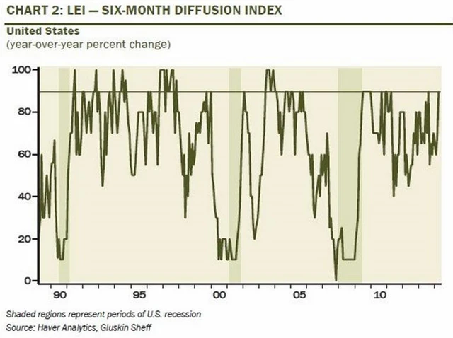 Rosenberg argumentuje vývojem hlavního ekonomického indikátoru USA (LEI), což je index, který zahrnuje hlavní statistiky jako žádosti o podporu v nezaměstnanosti, podnikové objednávky nebo akciový index S&P 500.