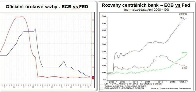 D'Onofrio: Fed ekonomiku podporuje mnohem více než ECB. Obě banky sice mají nízké úrokové sazby, ale rozdíl je v rozvahách. Nejvíce expanzivní centrální bankou od krize je Fed, který rozvahu rozšířil téměř pětkrát. I japonská centrální banka rozvahu navyšuje. Jediná banka, která rozvahu zmenšuje, je ECB.