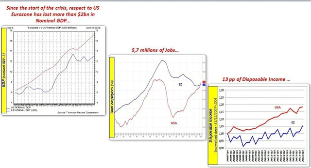 D'Onofrio: Eurozóna má oproti USA několik nevýhod. Je to skupina rozdílných zemí s rozdílnými politikami a potřebami a na jakémkoli rozhodování se podílí 18 hlav z 18 zemí eurozóny, což rozhodovací proces komplikuje. Fed reagoval na krizi uvolněním měnové politiky. Eurozóna to měla složitější.