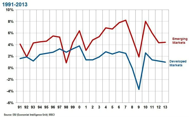 Mobius: Dalším podstatným faktorem o rozvíjejících se zemích je výkon jejich trhů. Zpočátku byla spousta lidí výkonem zklamaná, ale rozvíjející se trhy dnes už překonávají výkonnost rozvinutých trhů. V posledních deseti letech předčily rozvíjející se trhy výkonnost amerických a světových trhů v sedmi případech. Nepodařilo se jim to jen v letech 2013, 2011 a 2008.