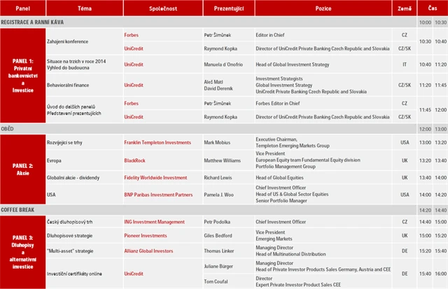Mluvit budou Manuela d'Onofrio (šéfka globální investiční strategie UniCredit), Raymond Kopka (ředitel privátního bankovnictví UniCredit pro ČR a SR) a investiční stratégové Dávid Dereník a Aleš Mátl.