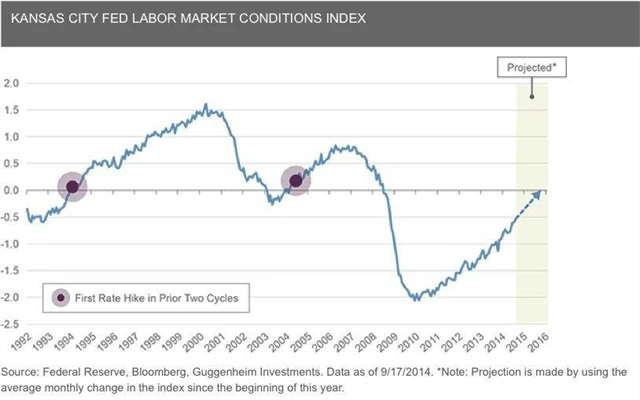 Na jeden velice zajímavý ve své nedávné poznámce k dění na trzích upozornil Scott Minerd z Guggenheim Partners. Ukazuje index podmínek na americkém pracovním trhu. Je patrné, že v posledních dvou cyklech vývoje základní sazby Fedu začala centrální banka se zvyšováním úroků vždy až v době, kdy se index dostal do kladného teritoria. Pokud by pokračoval ve zlepšování současným tempem, nad nulu se vyhoupne až v roce 2016.