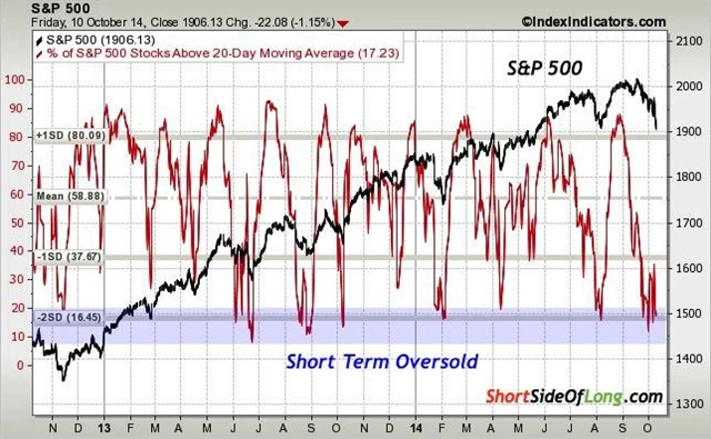 Nedávné výprodeje stáhly index S&P 500 do krátkodobého teritoria přeprodanosti. Akcií, které se obchodují nad 20denním klouzavým průměrem, je jen 17 %.