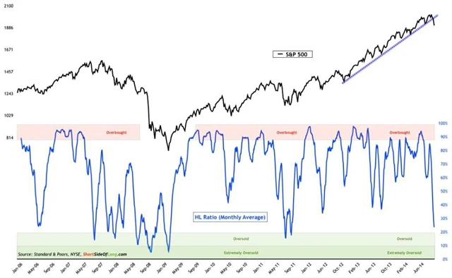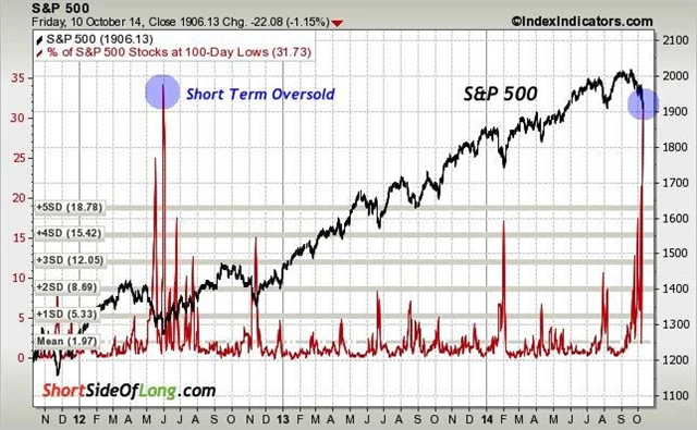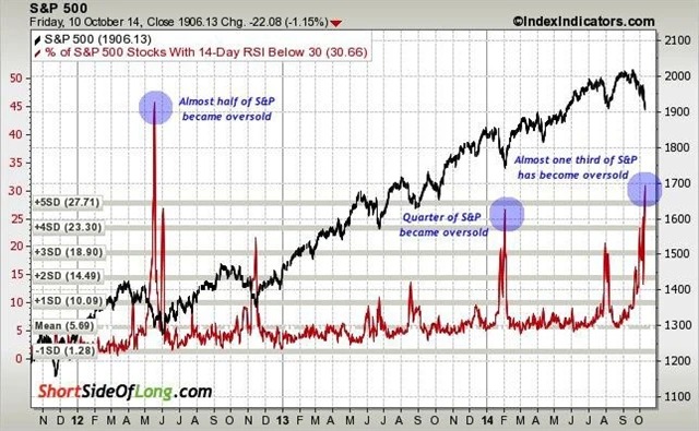 V srpnu bylo 20 % akcií z S&P 500 přeprodaných s RSI (index relativní síly) pod 30 a asi 10 % akcií se obchodovalo na nových 6měsíčních minimech. Nyní je však 30 % akcií s RSI pod 30 a 32 % akcií s novými 6měsíčními minimy.