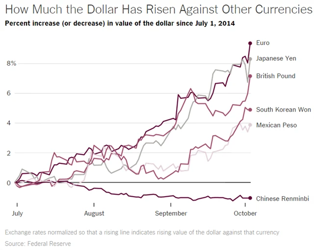 Dolar v posledních několika měsících výrazně zhodnocoval proti hlavním světovým měnám. Pokud ve světě zuří měnová válka, Spojené státy prohrávají na celé čáře. Kupodivu jim to ale (zatím) příliš nevadí. Před výročním zasedáním Mezinárodního měnového fondu a Světové banky totiž americký ministr financí Jack Lew zopakoval, že silnému dolaru fandí.