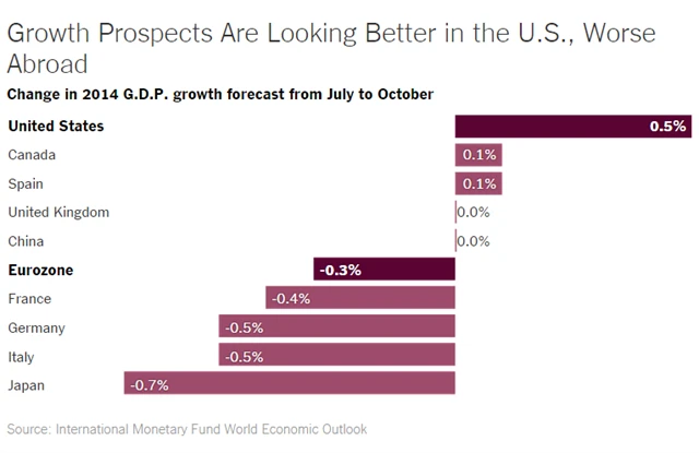 MMF revidoval výhled světové ekonomiky. Ve srovnání s červencovou předpovědí očekává mírně silnější růst v USA a mírně slabší v eurozóně (velmi slabé projekce pak zveřejnil pro největší ekonomiky eurozóny - Německo, Francii a Itálii).