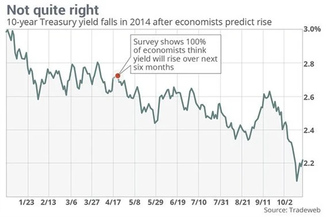 Na konci dubna předpovídalo v anketě agentury Bloomberg růst výnosů vládních bondů všech 67 oslovených ekonomů. Výnosy 10letých dluhopisů se tehdy pohybovaly kolem 2,73 %. Po šesti měsících rozhodně nejsou na 3 %, nebo dokonce 4 %, o nichž se na začátku roku hovořilo jako o nejbližší metě. Výnosy se od té doby naopak sesunuly o 46 bazických bodů na 2,27 % (údaj k 24. 10. 2014 – pozn. red.), přičemž se v polovině října krátce propadly dokonce až na 1,86 % (to byl ale jednodenní FLASH CRASH).