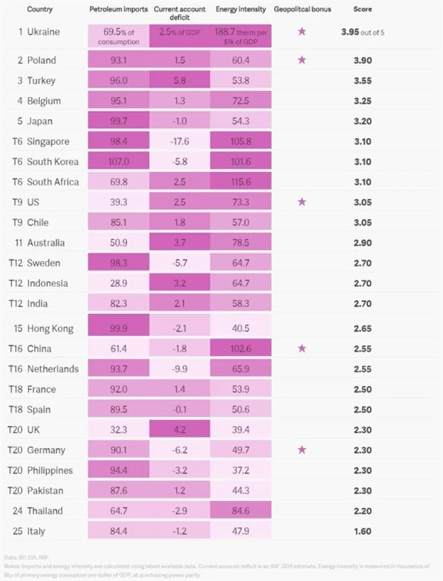 Žebříček vychází z několika předpokladů. Ukrajina nebo Polsko se tak dostaly na první místa díky tomu, že jsou velkými dovozci, navíc při levné ropě nebudou pod tak velkým politickým tlakem ze strany Ruska.