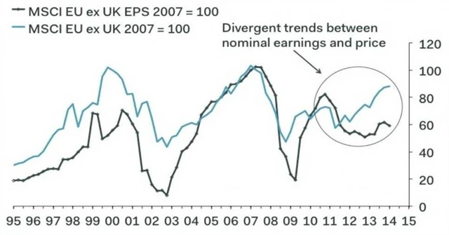 Hlavní ekonom Pantheon Macroeconomics pro Evropu Claus Vistesen zveřejnil následující graf, který dokazuje, že ceny akcií mdlé výsledky ignorují. A není to otázka posledních několika měsíců, je to dlouhodobý fakt. "Kde jsou evropské zisky?" ptá se.