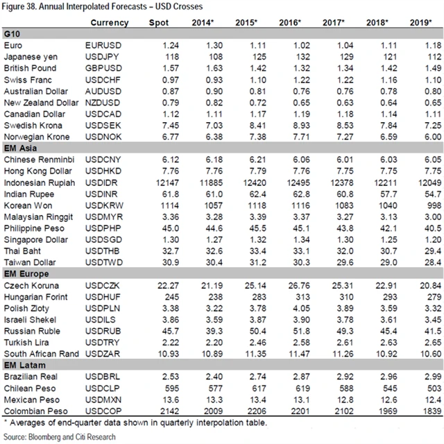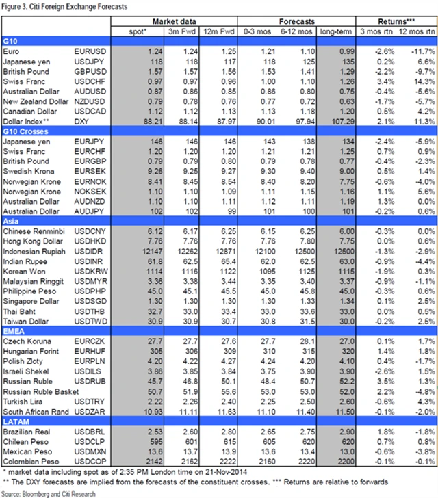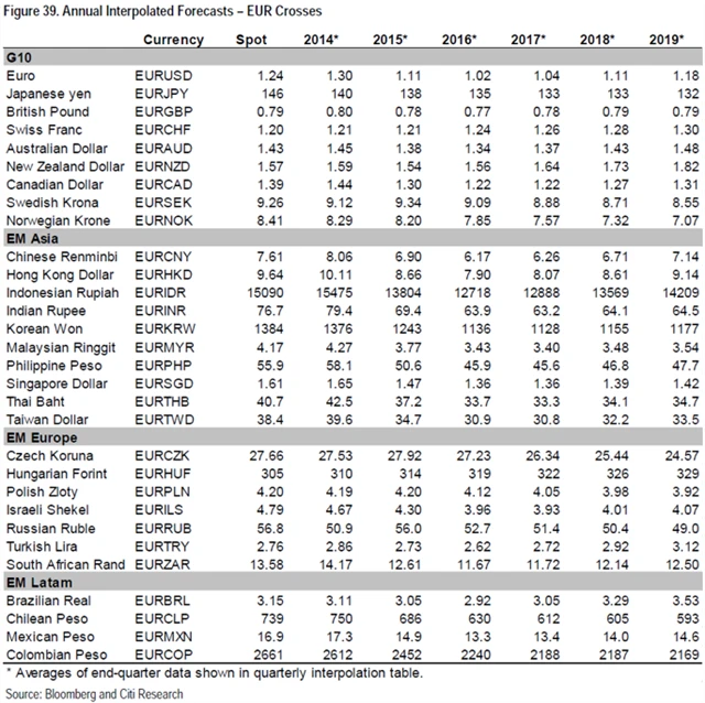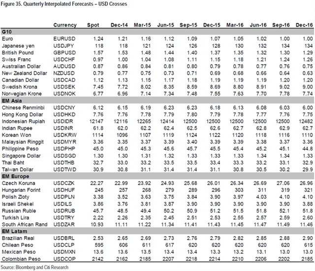 Analytici ze Citigroup aktualizovali svůj výhled obchodování s měnami. Podobně jako některé další banky, například Morgan Stanley, v predikci za horizont roku 2015 předpokládají prolomení parity eura vůči americkému dolaru. Rozdíl v nastavení měnových politik a v ekonomickém vývoji bude dominovat nad technickými faktory.