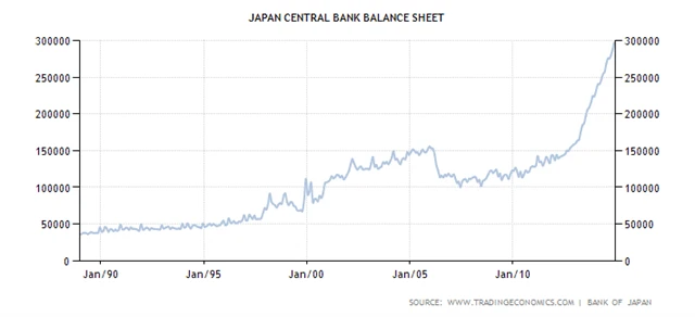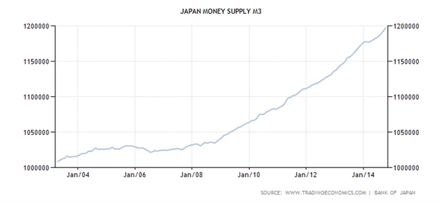 Peněžní zásoba v Japonsku se také rychle zvyšuje. Růstu ekonomiky to ještě loni pomáhalo, stačilo ale zvýšení daní, aby se japonské hospodářství opět propadlo do recese. Spotřebitelské ceny přitom také nerostou tak rychle, jak Bank of Japan chce.