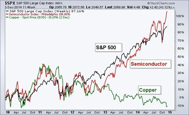 Zatímco cena mědi od roku 2012 klesá, ceny amerických akcií rostou. Měď se na začátku roku 2012 prodávala za zhruba 8 000 dolarů za tunu a index S&P 500 se ve stejné době pohyboval kolem 1 280 bodů. Necelý měsíc před koncem roku 2014 se tuna mědi prodává za méně než 6 400 dolarů, zatímco index S&P 500 se nachází nad 2 000 body.