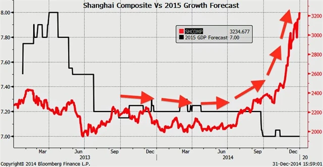 Lépe řečeno, čínský index Shanghai Composite byl hvězdou čtvrtého kvartálu. Za celý rok si čínský trh polepšil o více než polovinu. Graf byl v závěru roku hodně strmý. Srovnání s očekáváními ohledně vývoje HDP dává vzpomenout na americký příklad, kde akcie dlouho posilovaly za minimálního růstu ekonomiky.