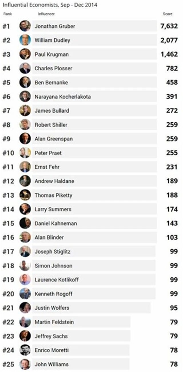 Výsledná podoba seznamu nejvlivnějších ekonomů je ale zvláštní i v jiných ohledech. První příčka podle časopisu The Economist patří Jonathanu Gruberovi, který však za tento výsledek nevděčí ničemu jinému než videu, ve kterém popisuje, jak americkému prezidentovi Baracku Obamovi pomohl oklamat americké voliče ohledně skutečné podoby kontroverzní reformy zdravotnictví. Časopis totiž žebříček sestavoval výhradně na základě frekvence výskytu jmen a výroků světových ekonomů v médiích, a to ještě jen v období mezi zářím a prosincem loňského roku.