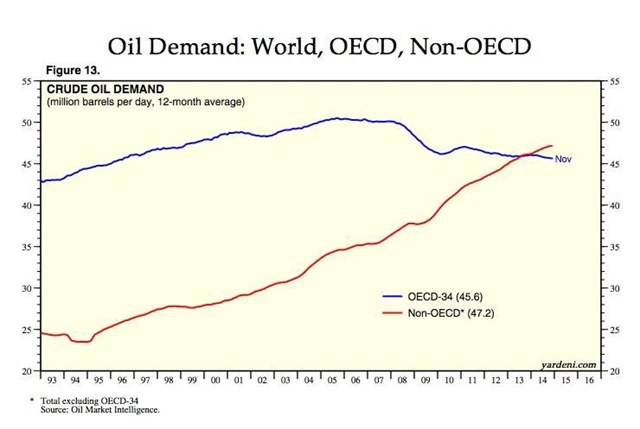 Ropy se těží tolik, že pro ni není ve světové ekonomice využití. Pokrok nezastavíte, a tak se ve vyspělých zemích spotřebovává stále méně ropy. Poptávku tak udržují rozvíjející se trhy.